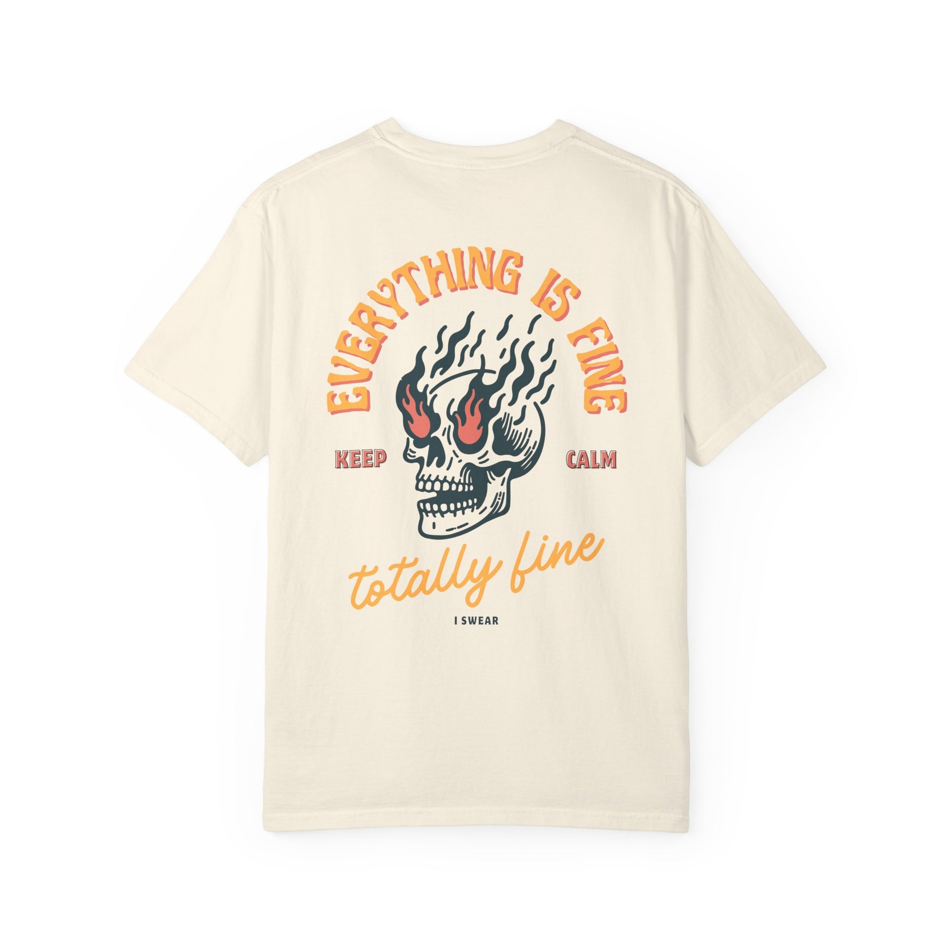 Features: • Unisex garment-dyed tee with a vintage, lived-in feel • 100% ring-spun cotton for softness and durability • Classic fit with relaxed shoulders • Large back print: flaming skull “Everything Is Fine (I Swear)” design • Small matching front detail • Made to order