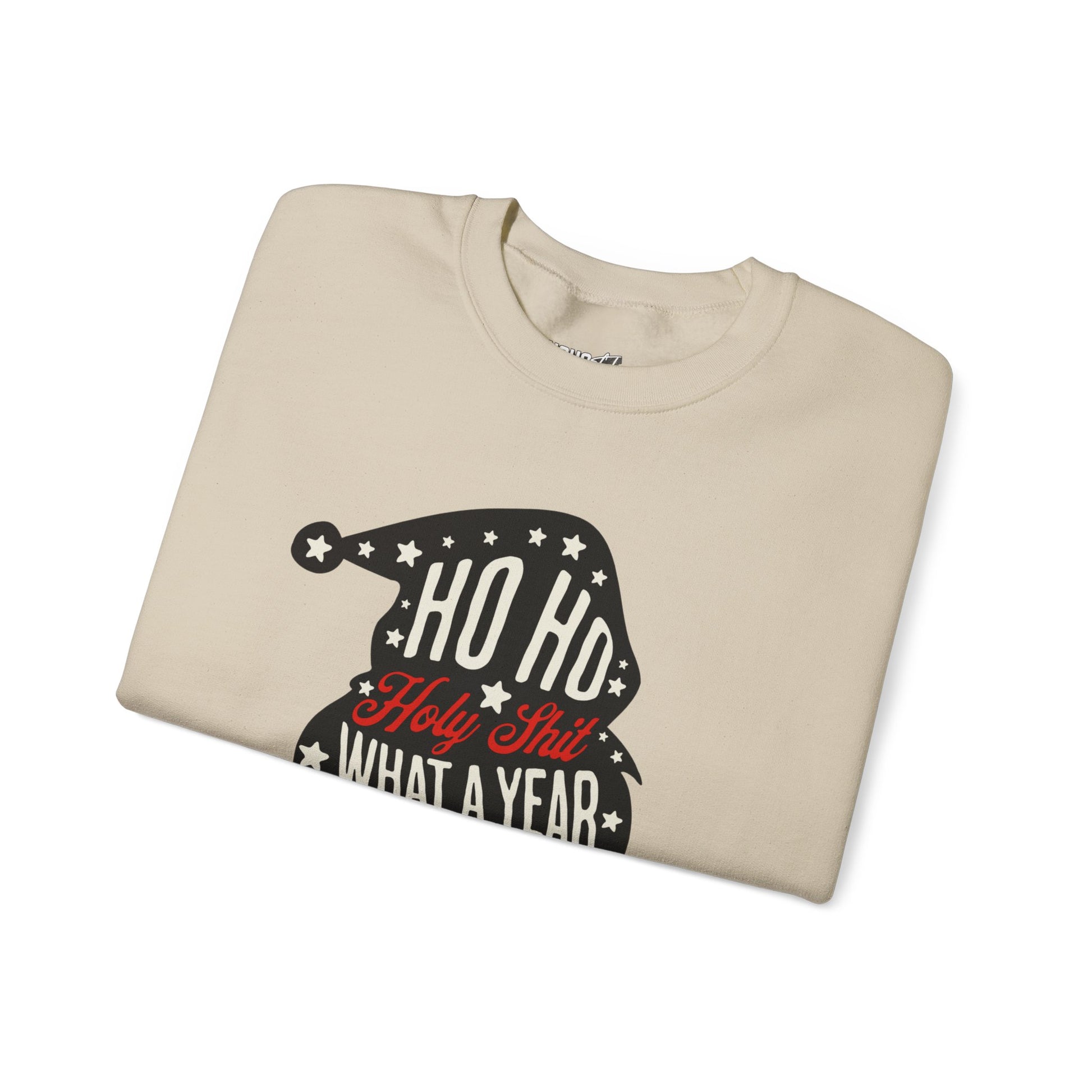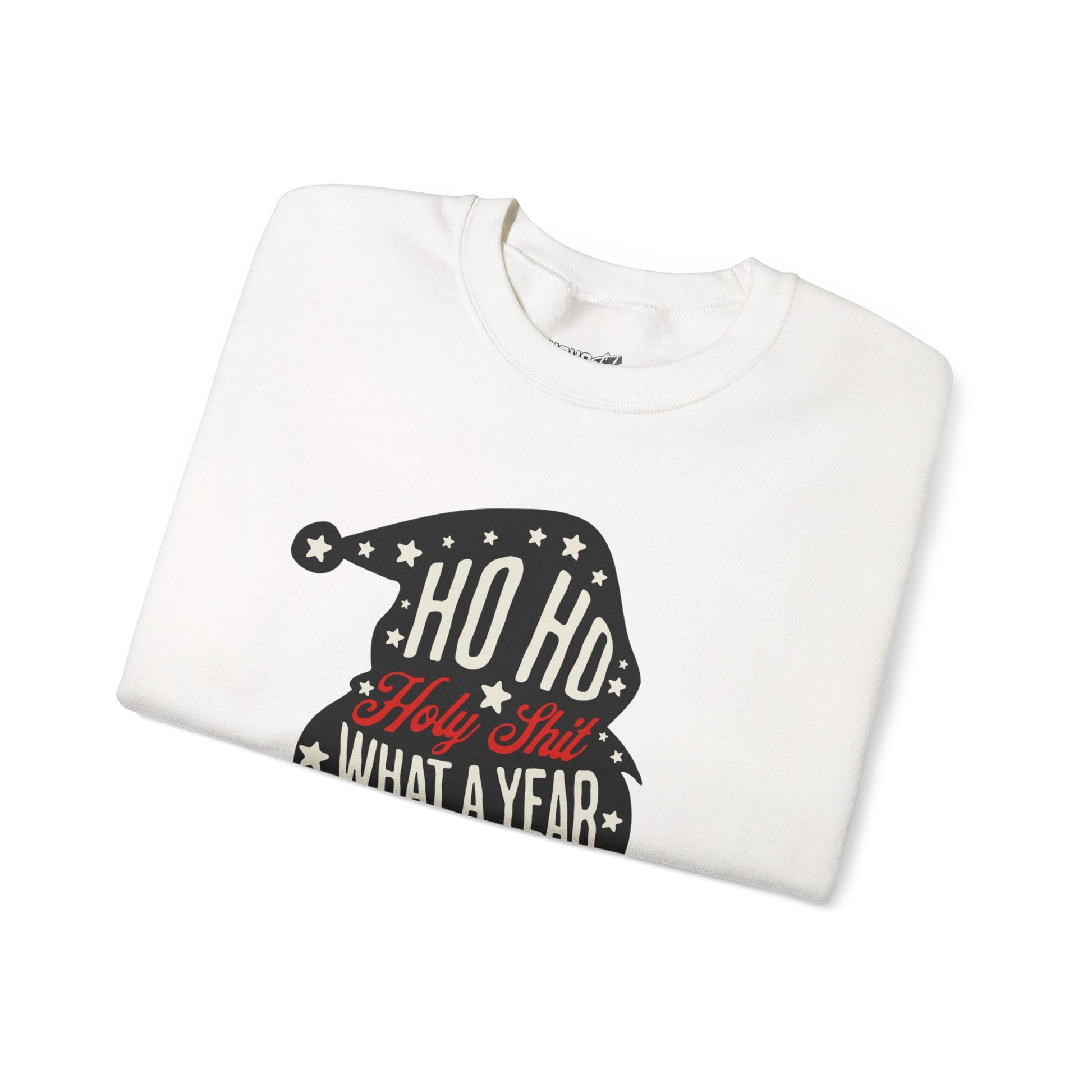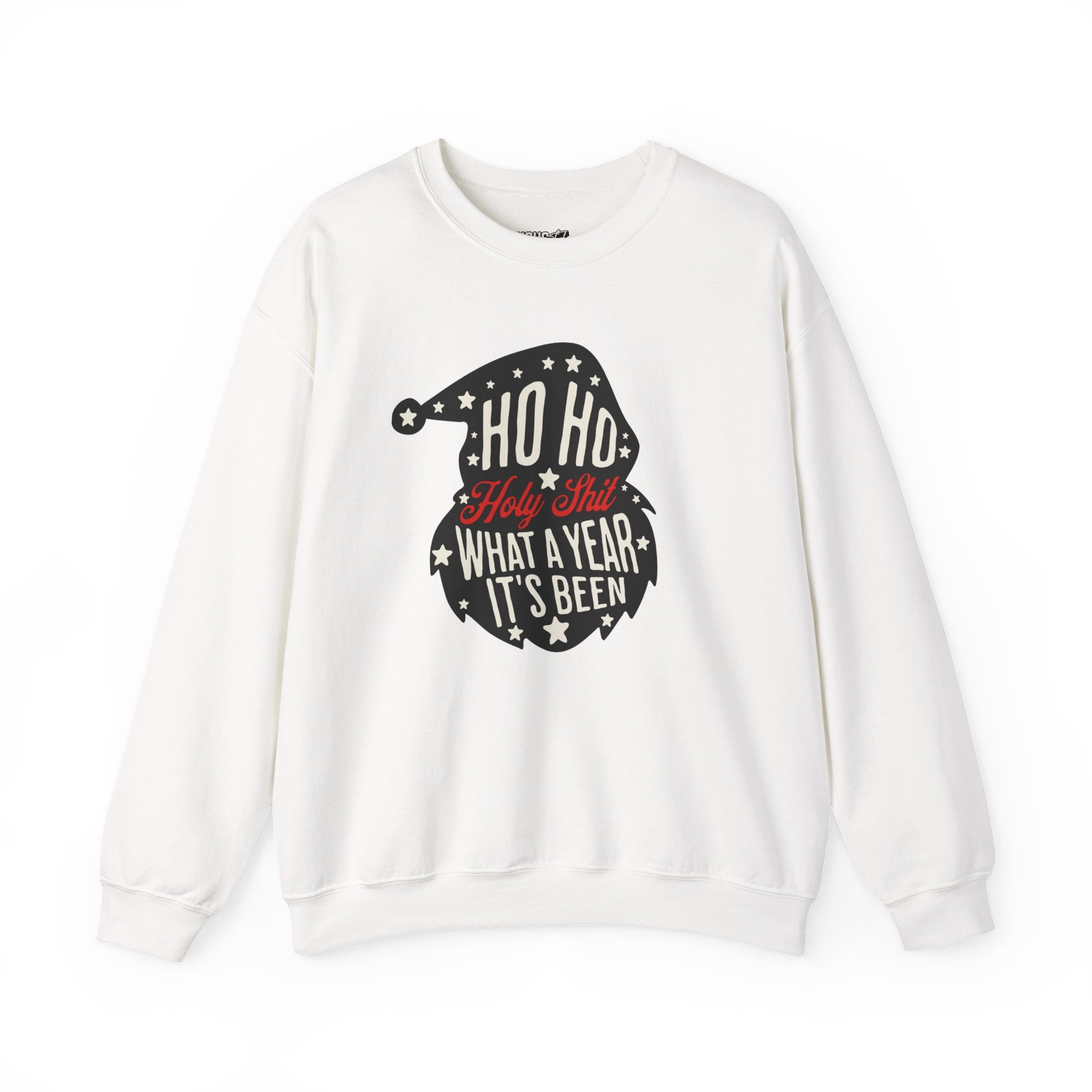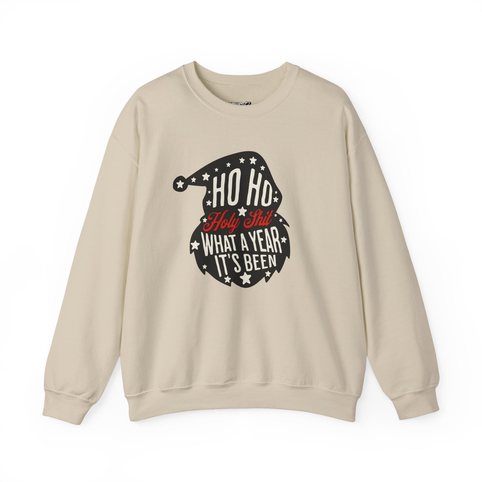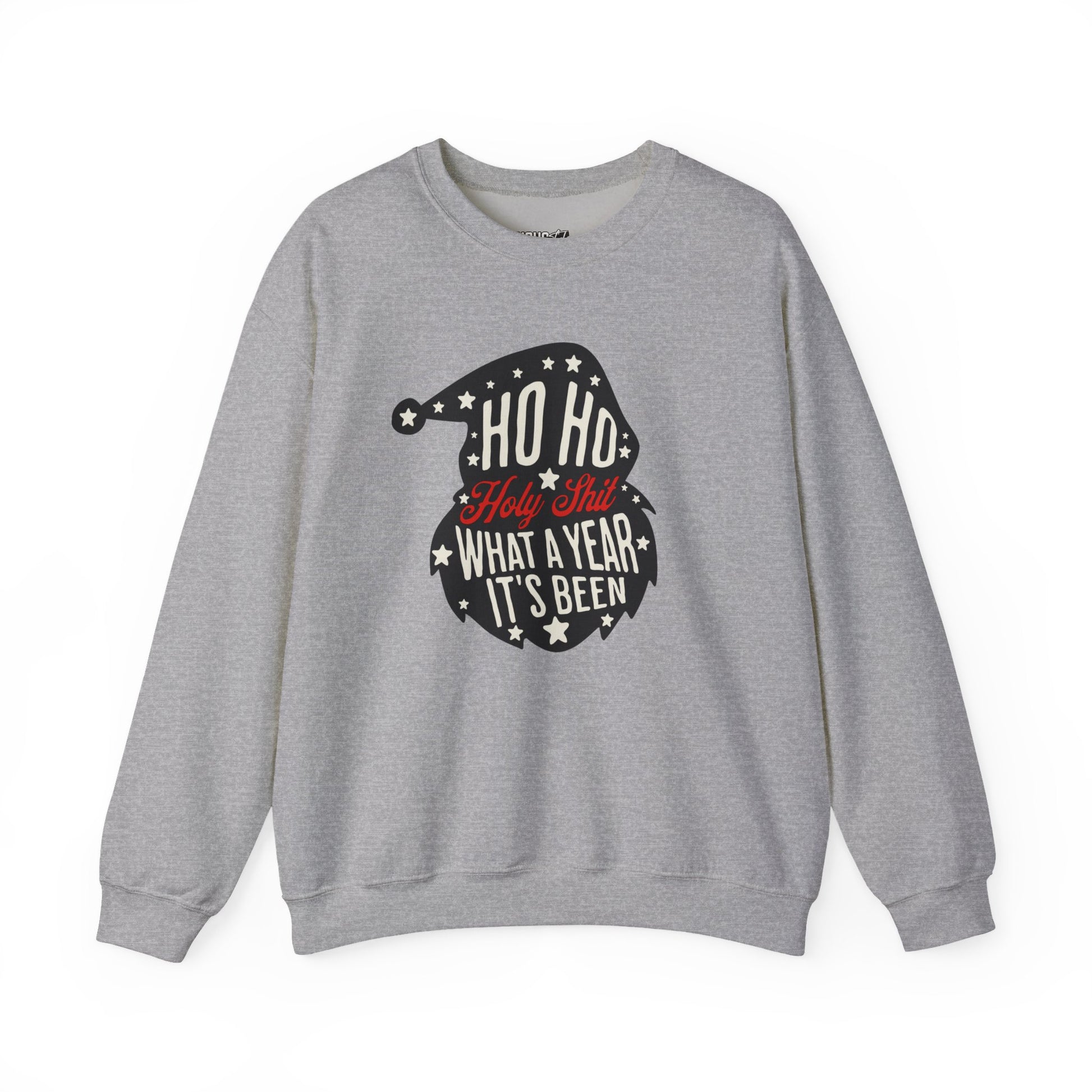 • Midweight fleece — soft inside, smooth outside • Unisex fit — true to size or size up for a relaxed look • Printed front graphic: Ho Ho Holy Shit What a Year It’s Been inside a Santa hat design • Made to order