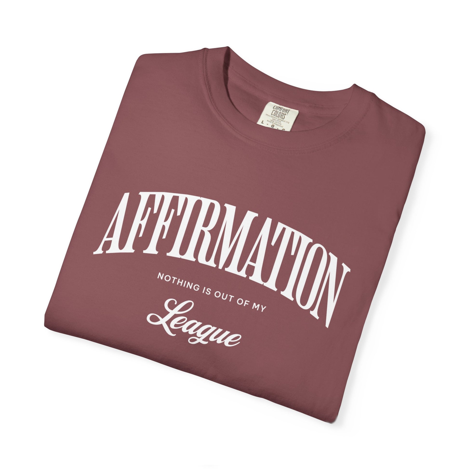 Features: • Midweight cotton — soft, breathable, confidence-approved • Unisex fit — true to size or size up for relaxed superiority • Printed front graphic: Affirmation collegiate-style text • Made to order
