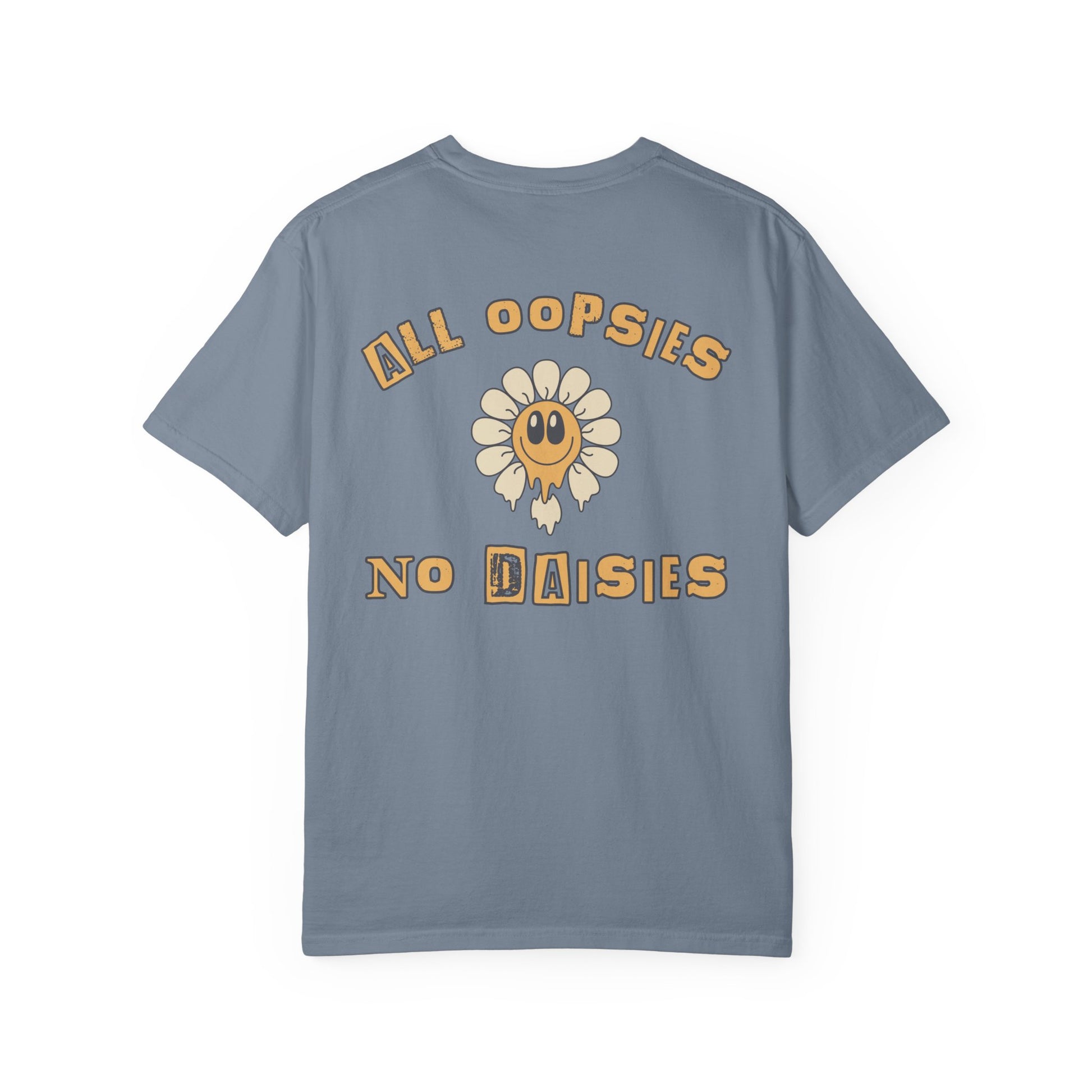 Features: • Unisex garment-dyed tee with a vintage, lived-in feel • 100% ring-spun cotton for softness and durability • Classic fit with relaxed shoulders • Large back graphic: “All Oopsies No Daisies” with smiley daisy art • Small matching front detail (varies by color) • Made to order