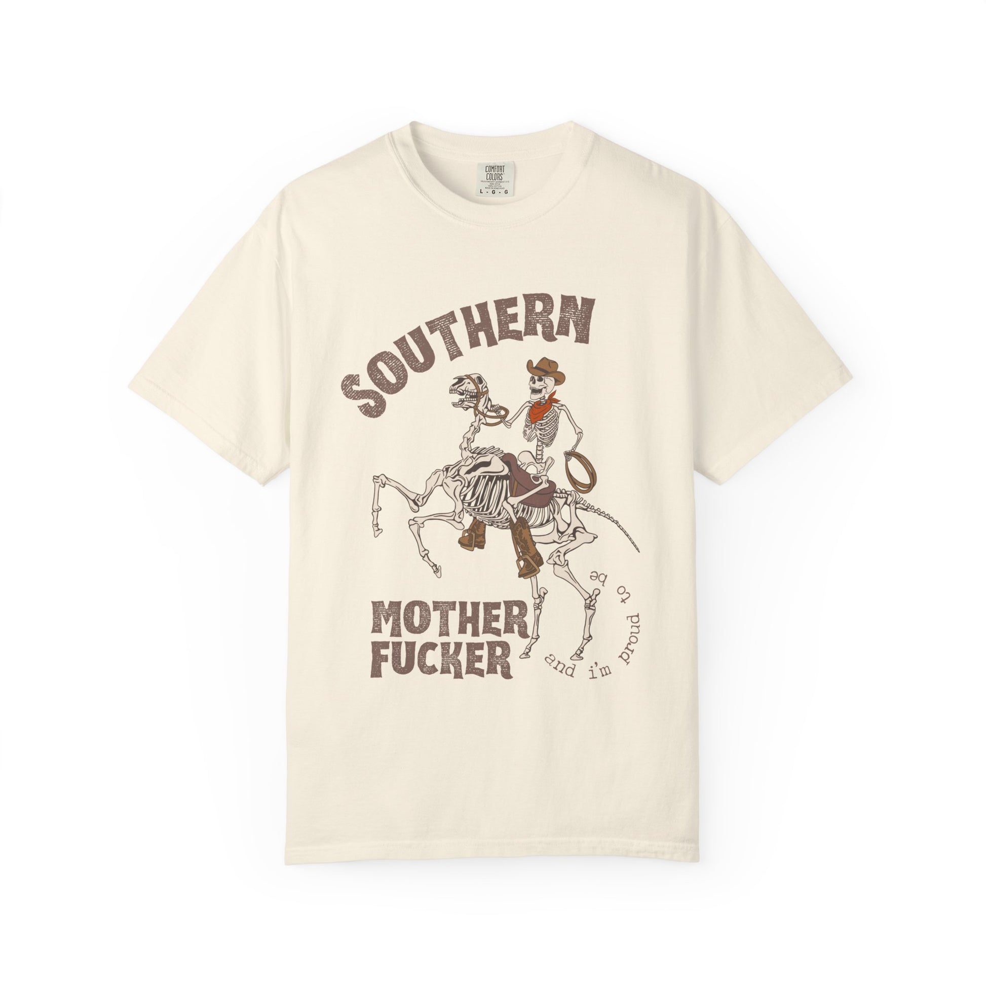 Features: • Unisex garment-dyed tee with a vintage, lived-in feel • 100% ring-spun cotton for softness and durability • Classic fit with relaxed shoulders • Printed front graphic: cowboy skeleton “Southern Motherfucker” design • Available in multiple colors • Made to order