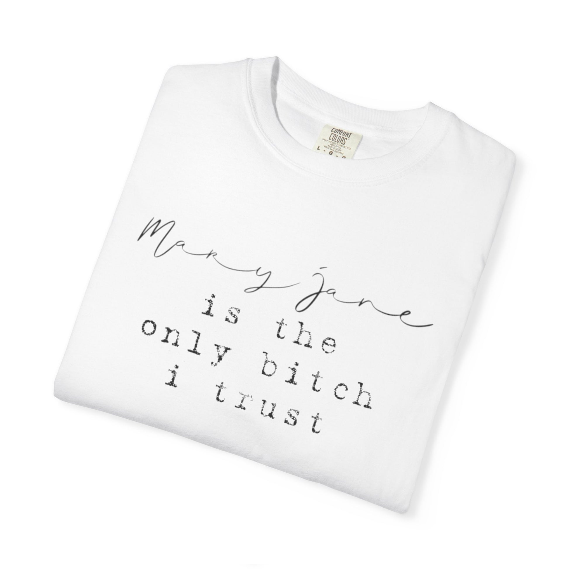 Features: • Unisex garment-dyed tee with a vintage, lived-in feel • 100% ring-spun cotton for softness and durability • Classic fit with relaxed shoulders • Printed front graphic: “Mary Jane is the only bitch I trust” • Available in multiple colors • Made to order
