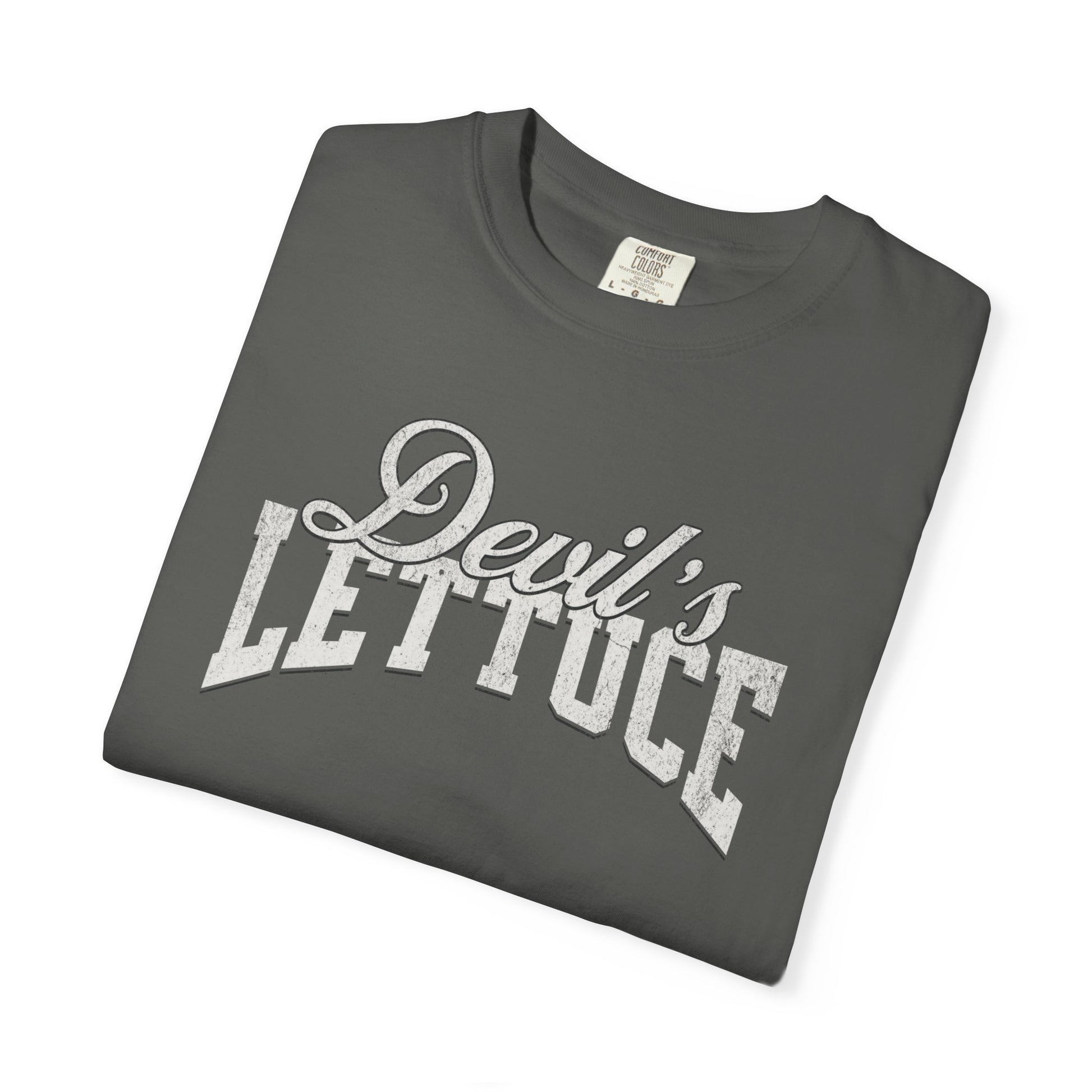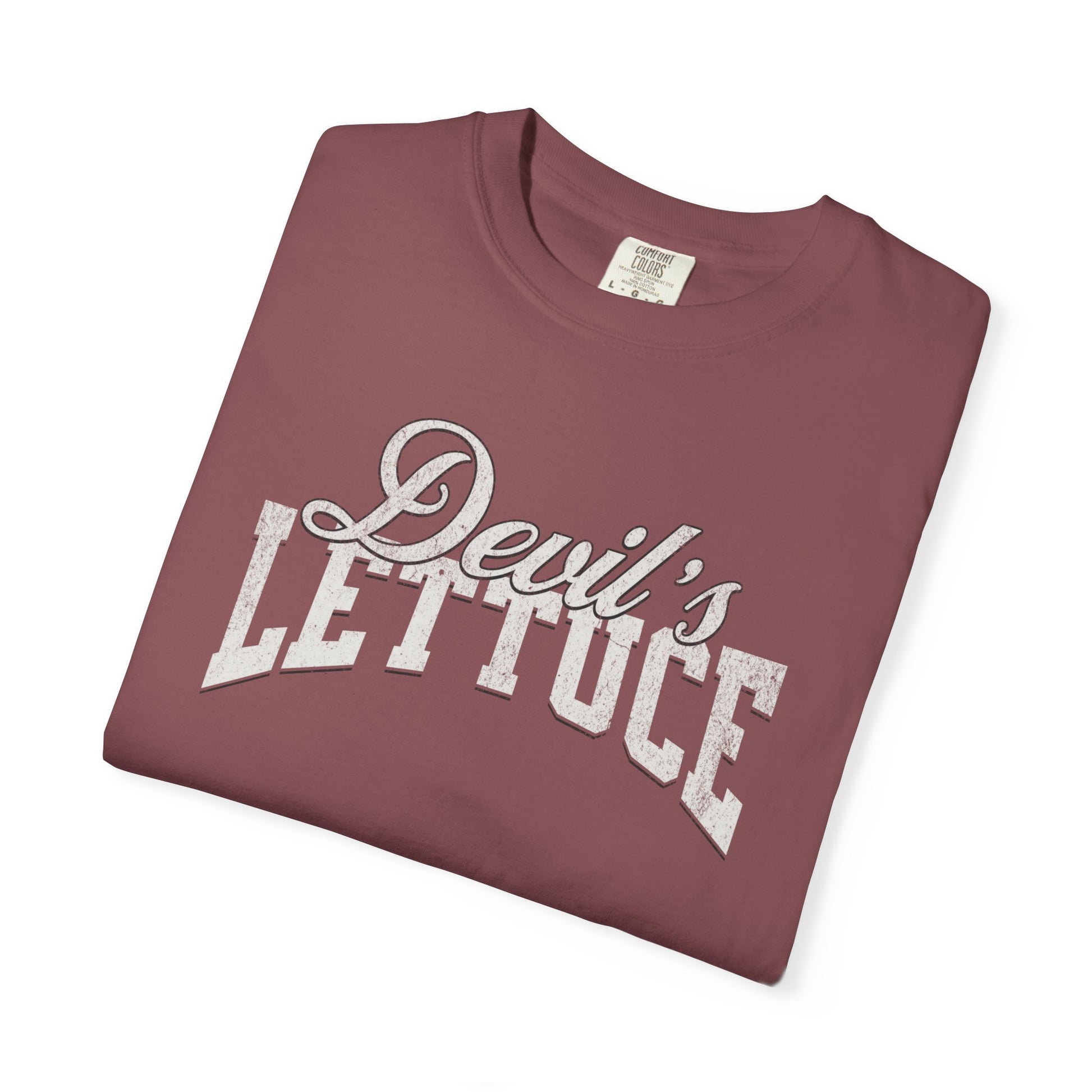 Features: • Unisex garment-dyed tee with a vintage, lived-in feel • 100% ring-spun cotton for softness and durability • Classic fit with relaxed shoulders • Printed front graphic: “Devil’s Lettuce” varsity-style design • Available in multiple colors • Made to order